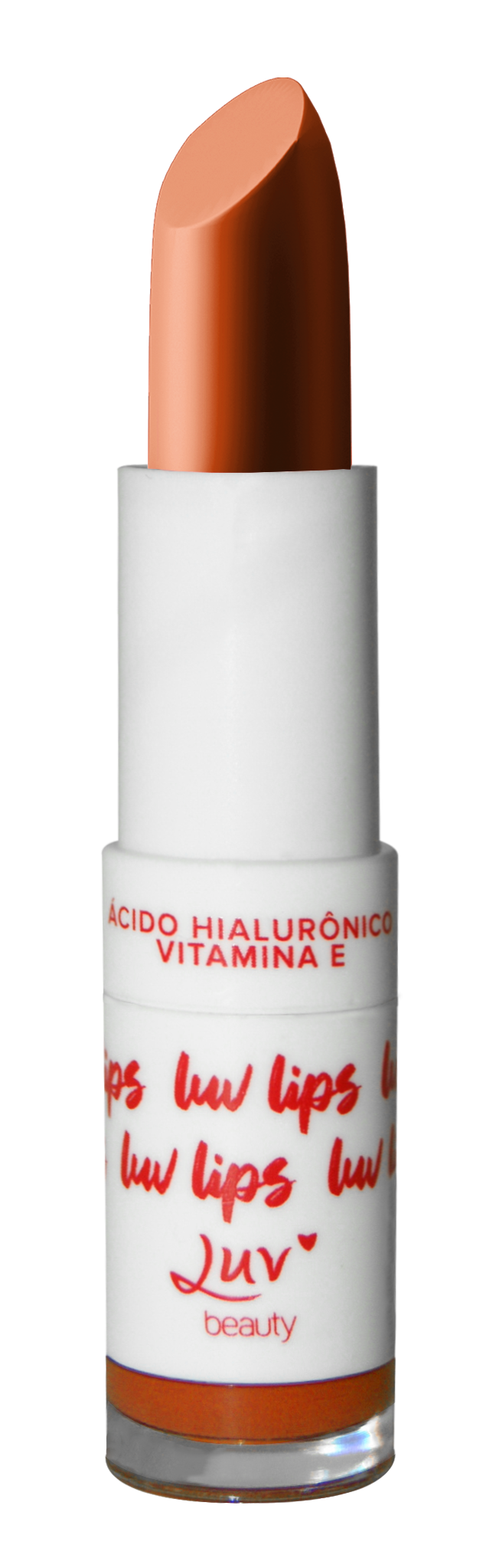 Batom Luv Lips com acabamento cremoso. Desliza facilmente e de maneira uniforme sobre os lábios.